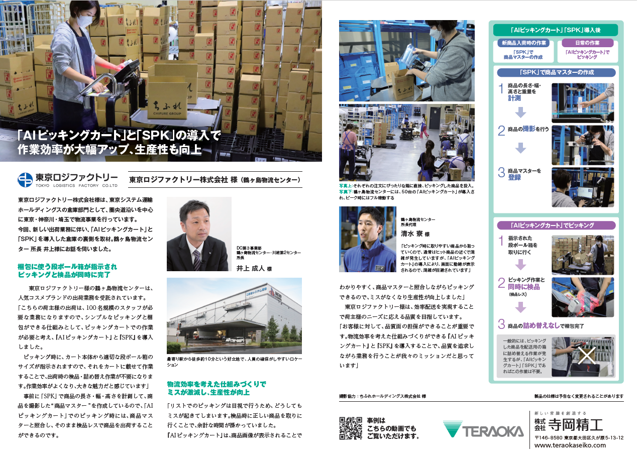 Tokyo Logistics Factory is a logistics company with operations in Tokyo, Kanagawa, and Saitama, Japan. The company introduced AI picking carts and SPK into its new shipping operations to improve work efficiency and increase productivity.